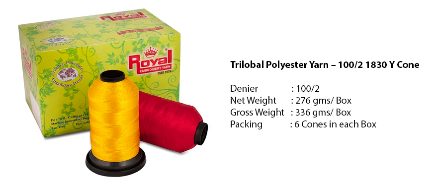 Banking upon our extensive industry experience, we have been able to position our-self among one of the most reputed manufacturers, suppliers and exporters of various types of Embroidery Yarn. Range offered by us comprises of Viscose Rayon Embroidery Thread and Trilobal Polyester Embroidery Yarn. All these Yarns are manufactured using high quality raw material procured from trustworthy vendors and are known for quality, strength & colourfastness and are certified with Oeko-Tex standard 100 certification. The wide assortment of products offered by us is based on latest technology and is inspected & tested at every facet of our proceedings for different Quality parameters. Our profound infrastructure combined with team of skilled professional has helped us in manufacturing products that match well with the industry standards. Thus, with the high quality products that we offer, we have gained utmost client satisfaction across the globe especially in Indian Subcontinent.